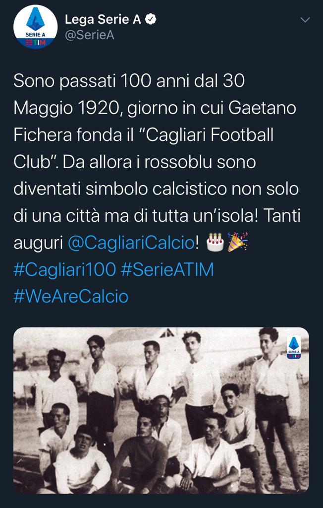 Attraverso un tweet accompagnato da una bellissima foto d’epoca, la Lega Serie A ha reso omaggio al Cagliari nel giorno del suo centenario