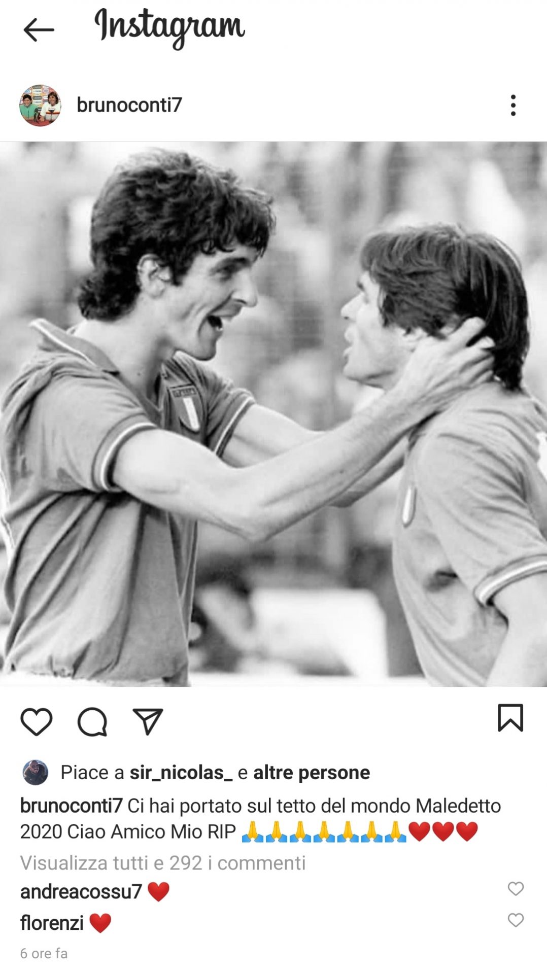 Bruno Conti, compagno in Nazionale nel Mundial spagnolo, ha voluto ricordare attraverso un post su Instagram Paolo Rossi. Ci hai portato sul tetto del mondo. Maledetto 2020. Ciao amico mio, riposa in pace“.