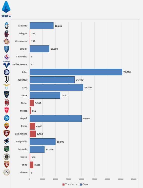 In trasferta il record di giornata se lo aggiudica la Salernitana che grazie ai 4.500 supporters presenti al Mapei di Reggio Emilia hanno incitato i loro beniamini dall’inizio alla fine nonostante il pesante passivo finale. Campani seguiti dalla Roma, con i 4.000 presenti a San Siro nel match di cartello, e dal Milan con 3.100 presenti ad Empoli. Quarto posto occupato dal Torino grazie ai 2.600 granata presenti sugli spalti del Maradona mentre alla quinta posizione troviamo il Monza con gli 850 supporters presenti nella trasferta vittoriosa di Genova. Più staccati delle altre, in sesta settima e ottava posizione, troviamo lo Spezia (300), il Bologna (166) e la Cremonese (132). Non comunicati i dati di Udinese e Fiorentina.