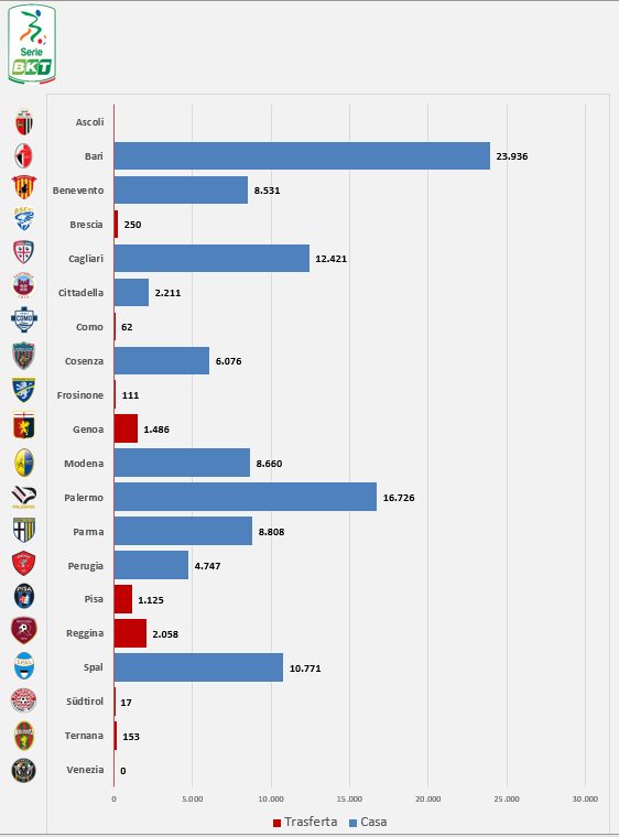 In serie B il record di giornata se lo aggiudica “a mani basse” il Bari nel match casalingo contro il Brescia di fronte a 23.936 biancorossi: numeri da serie A. Al secondo posto troviamo un’altra piazza con numeri da massima serie, ossia il Palermo (16.726 spettatori). Chiude il podio il Cagliari con 12.421 presenze. Al quarto posto troviamo la Spal con 10.771 supporters mentre in quinta posizione si piazza il Parma con 8.808 fedelissimi. Poco più in basso degli emiliani si evincono il Modena (8.660) e il Benevento (8.531). Ultime due posizioni di giornata presiedute dal Cosenza, che non va oltre i 6.076 beniamini contro il Como, e il Cittadella con 2.211 spettatori.