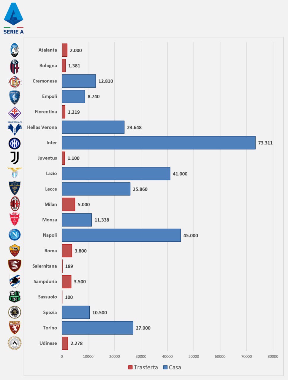 In trasferta vengono sfoderati bei numeri, soprattutto nelle primissime posizioni. Al primo posto si piazza il Milan con i 5.000 presenti nella trasferta di Torino, a seguire troviamo la Roma con 3.800 fedelissimi presenti al Bentegodi di Verona e la Sampdoria grazie ai 3.500 blucerchiati. Quarto posto occupato dall’Udinese con i 2.278 spettatori. Alla quinta posizione troviamo l’Atalanta con i 2.000 nerazzurri presenti nella trasferta di Empoli. A seguire troviamo un trio con numeri molto vicini tra loro: nello specifico Bologna (1.381), Fiorentina (1.219) e Juventus (1.100). Chiudono la classifica la Salernitana con 189 presenti all’Olimpico (tifoseria in protesta sulle restrizioni adottate per l’organizzazione dell’ evento) e il Sassuolo con 100 presenti a Napoli.