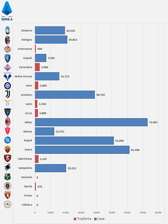 Il tifo in trasferta non è mancato neanche questo fine settimana. Rileviamo il primato conquistato dalla Fiorentina con 3.000 presenti a San Siro. A seguire si piazza, al secondo posto, la sorprendente Salernitana grazie ai 2.197 supporter giunti a Monza mentre il podio viene completato dall’Inter con i 2.000 presenti arrivati a Bergamo nel match di domenica delle 12:30. Quarta posizione occupata dal Lecce con 1.800 sostenitori; la quinta e la sesta sono invece presiedute da Lazio e Cremonese che rilevano rispettivamente 1.518 e 600 fedelissimi al proprio seguito. Settima posizione occupata dallo Spezia con 570 bianconeri presenti. Non comunicati i dati di Udinese, Torino e Sassuolo.