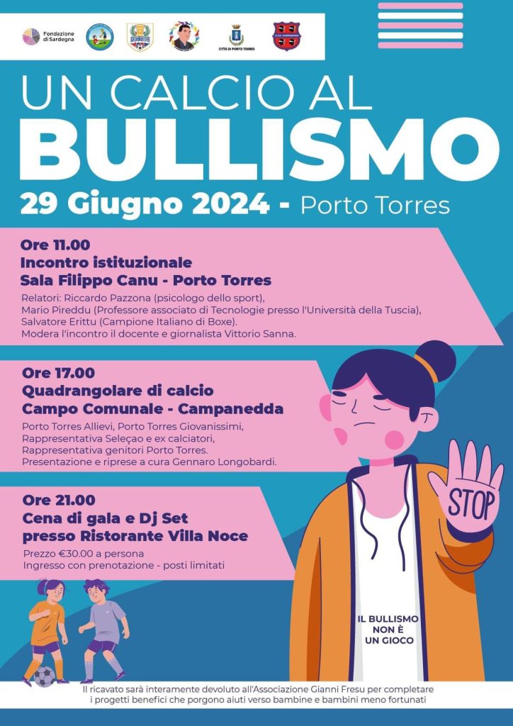 IL TEMA. Sabato 29 giugno, la città di Porto Torres (Sassari) ospita la giornata “Un calcio al bullismo”, organizzata dall’Associazione Gianni Fresu. Alle ore 11 avrà luogo un convegno sull’argomento, presso la Sala Filippo Canu, moderato dal noto radiocronista e docente Vittorio Sanna. In serata, dalle 19, verrà disputato un quadrangolare di calcio al campo comunale Campanedda.