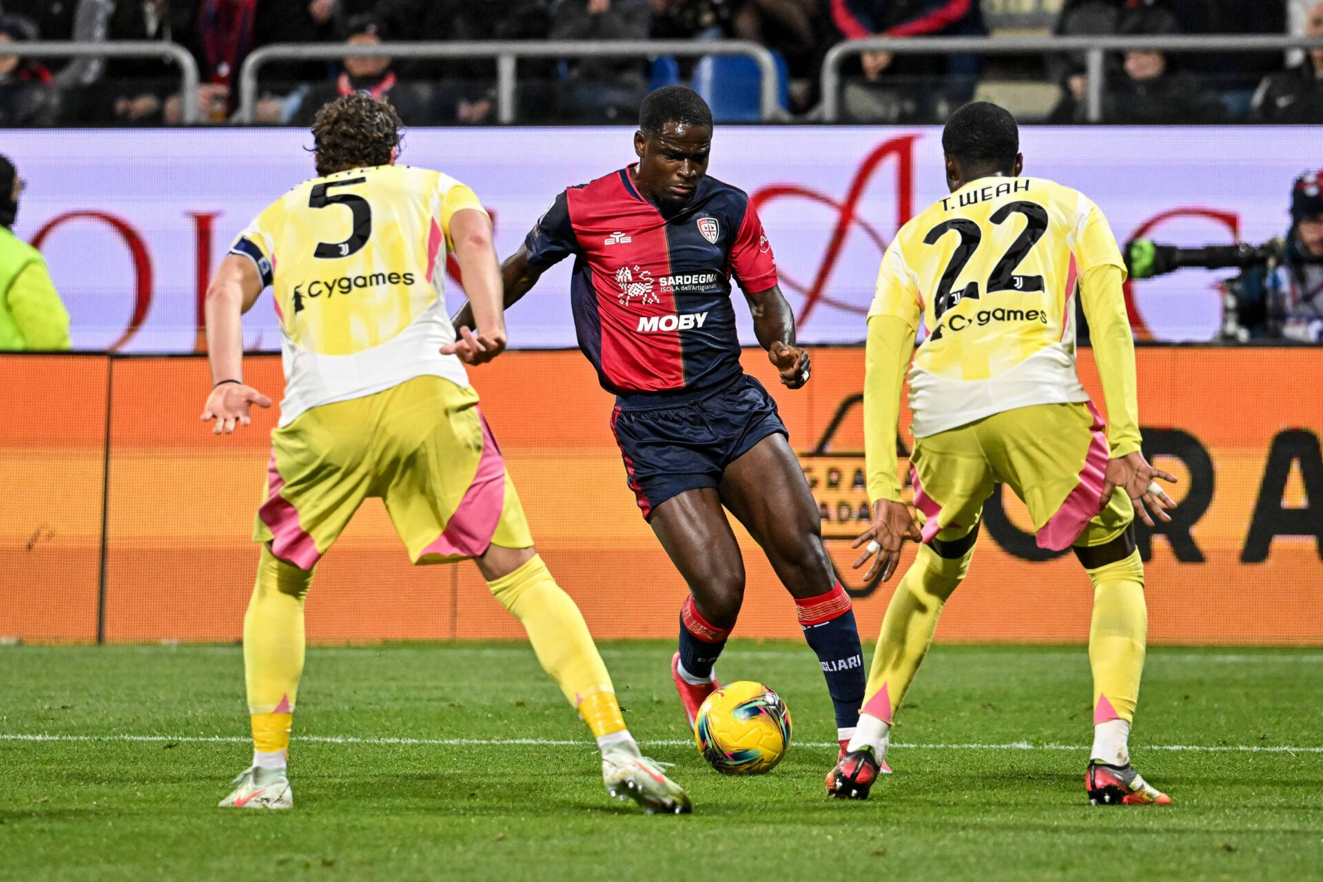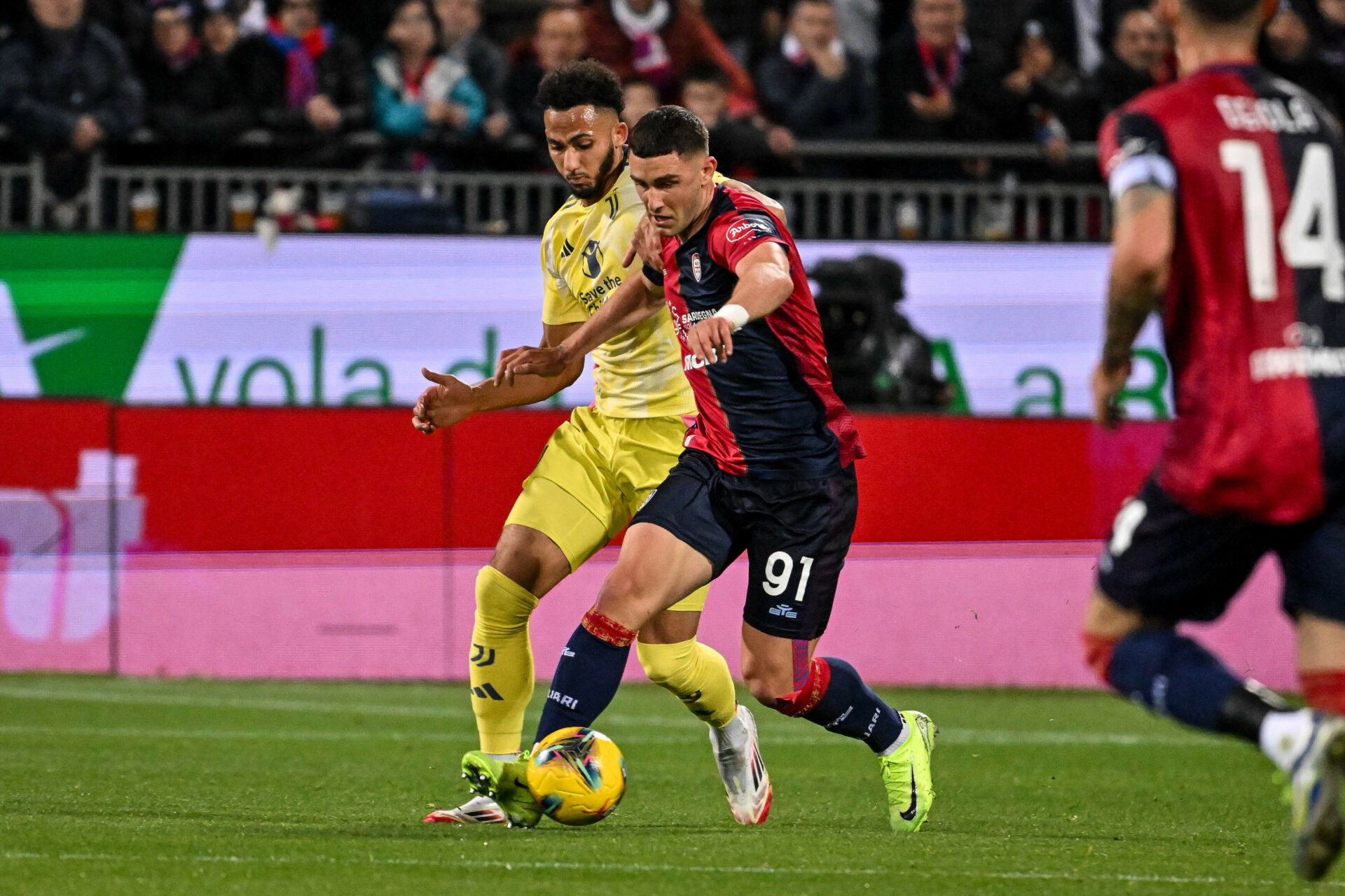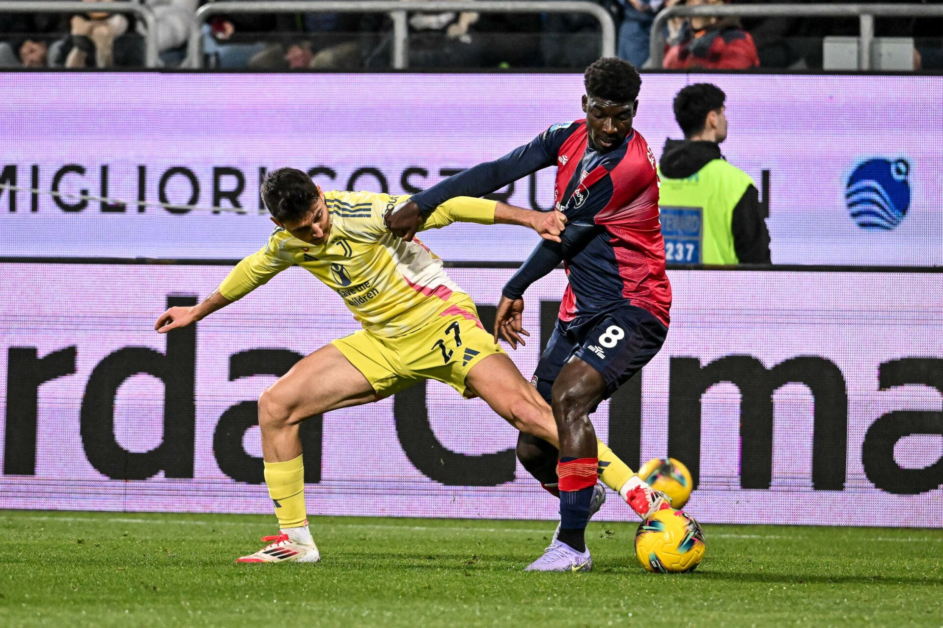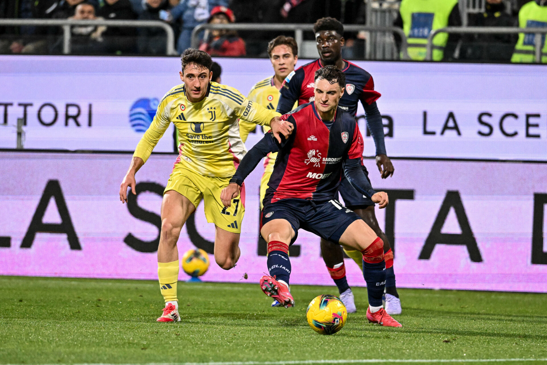 Andrea Cambiaso of Juventus FC, Michel Adopo of Cagliari Calcio during Cagliari Calcio vs Juventus FC, Italian soccer Serie A match in Cagliari, Italy, February 23 2025
