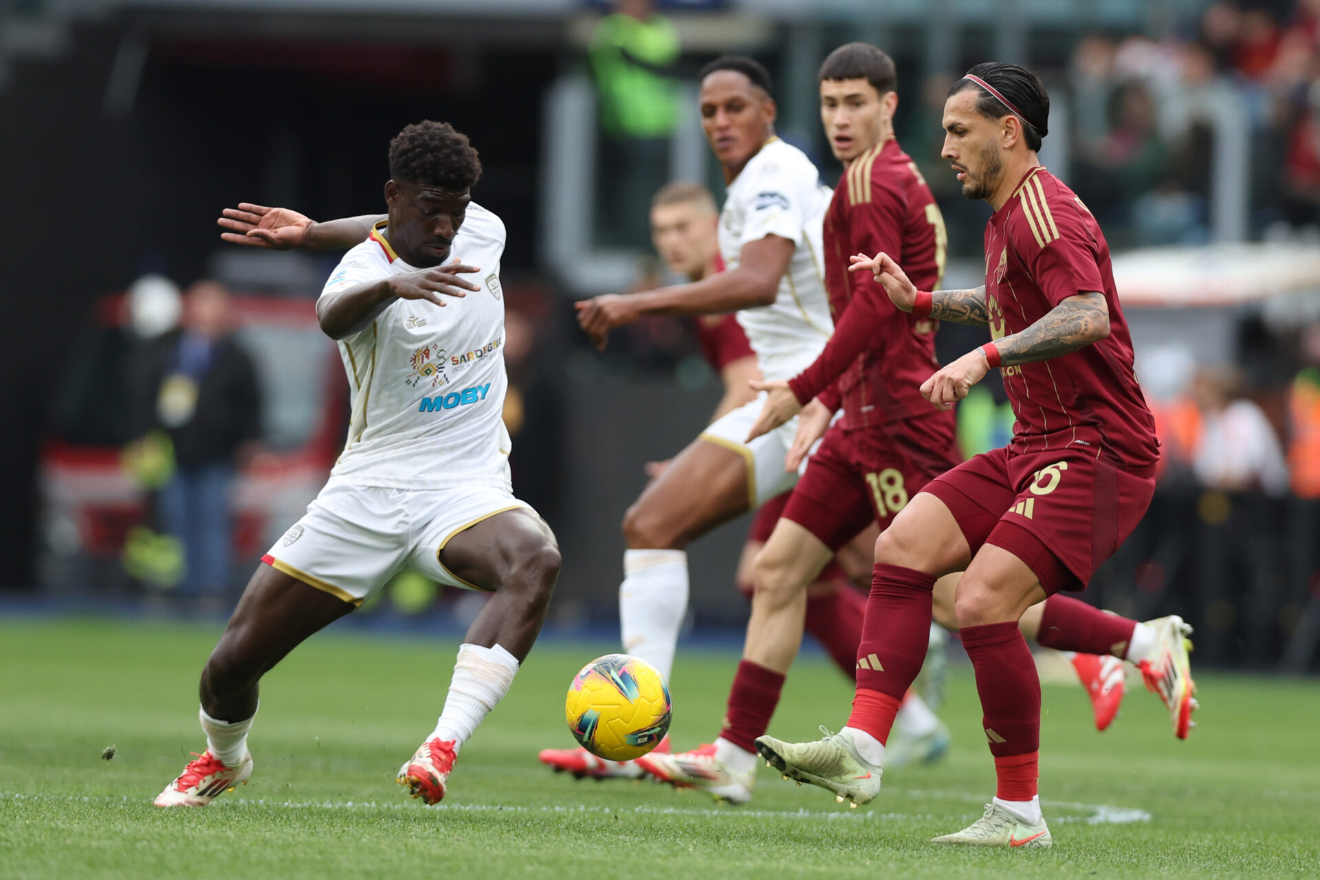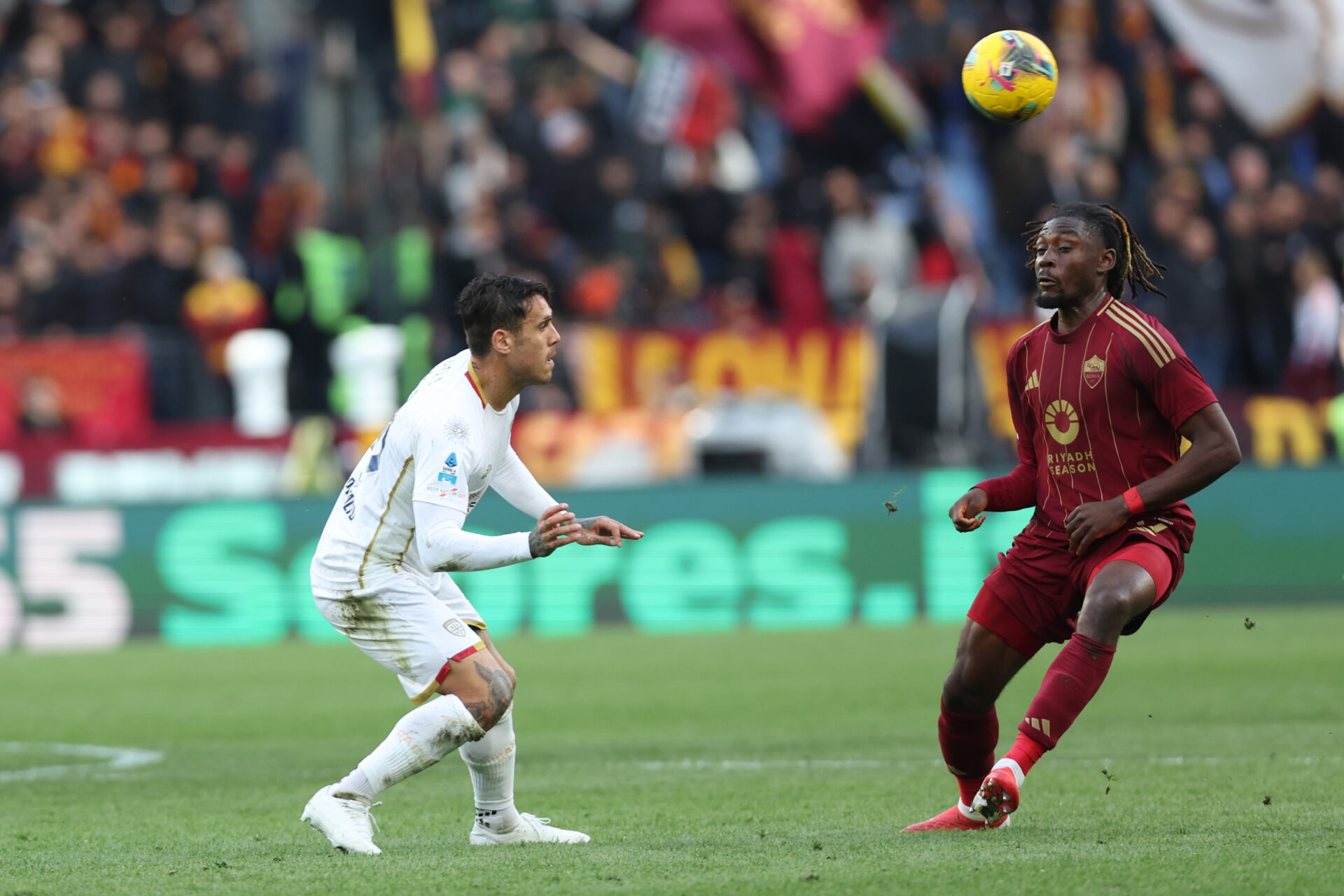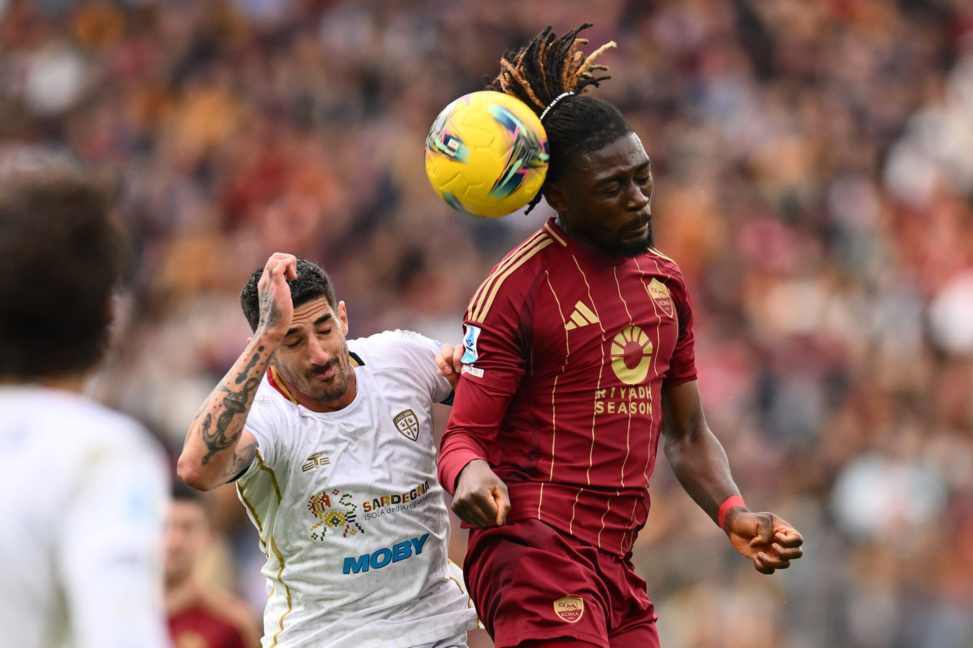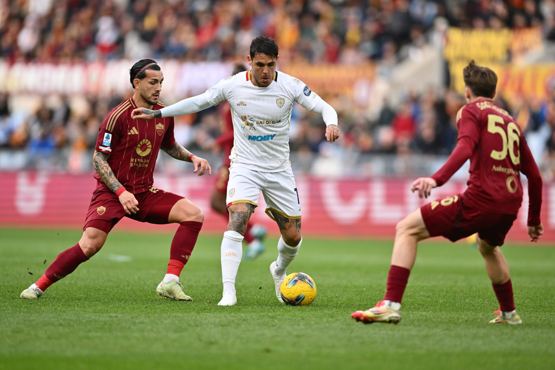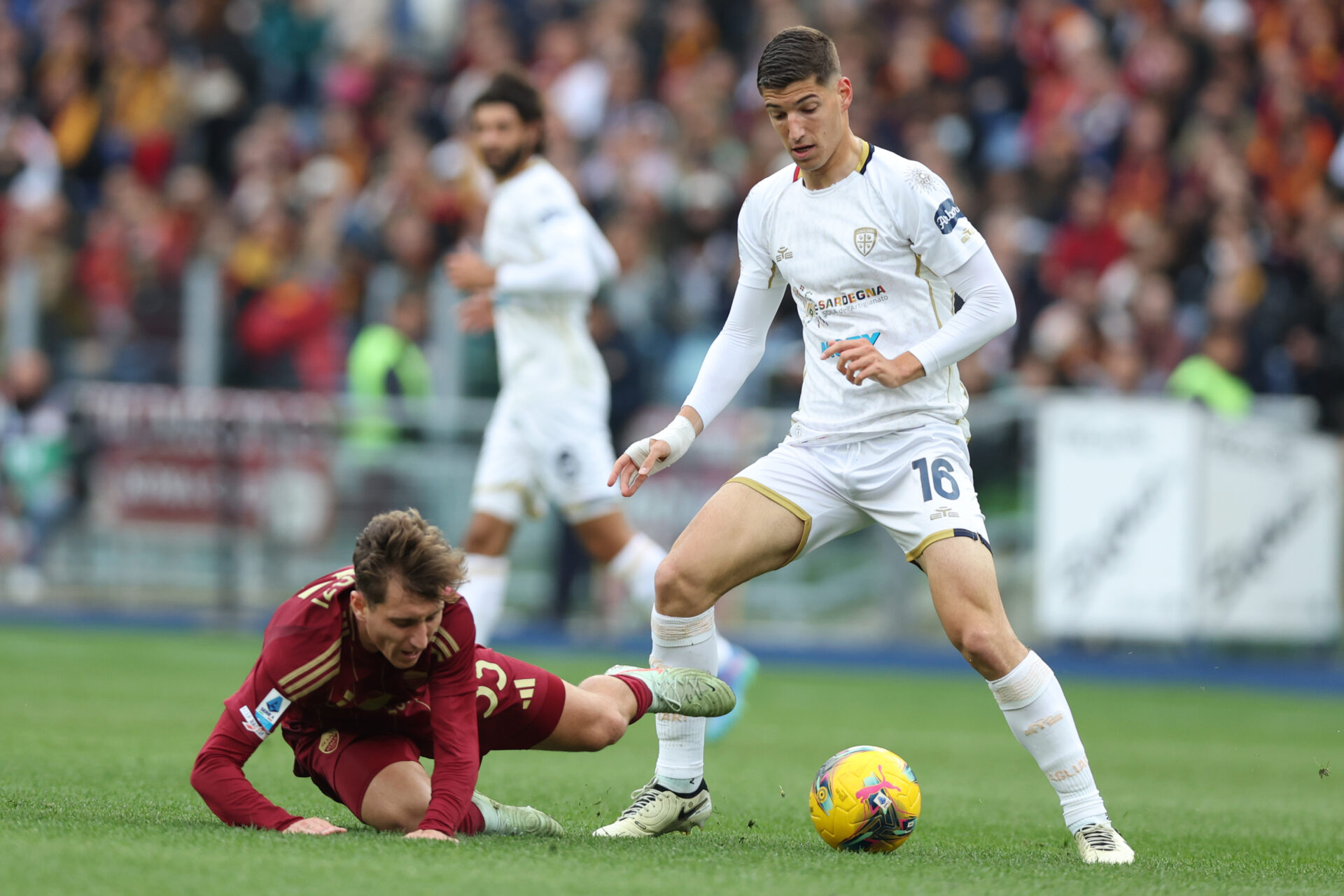 Alessandro Deiola of Cagliari Calcio and Manu Kone of A.S. Roma are in action during the 29th day of the Serie A Championship between A.S. Roma and Cagliari Calcio at the Olympic Stadium on March 16, 2025 in Rome, Italy.
