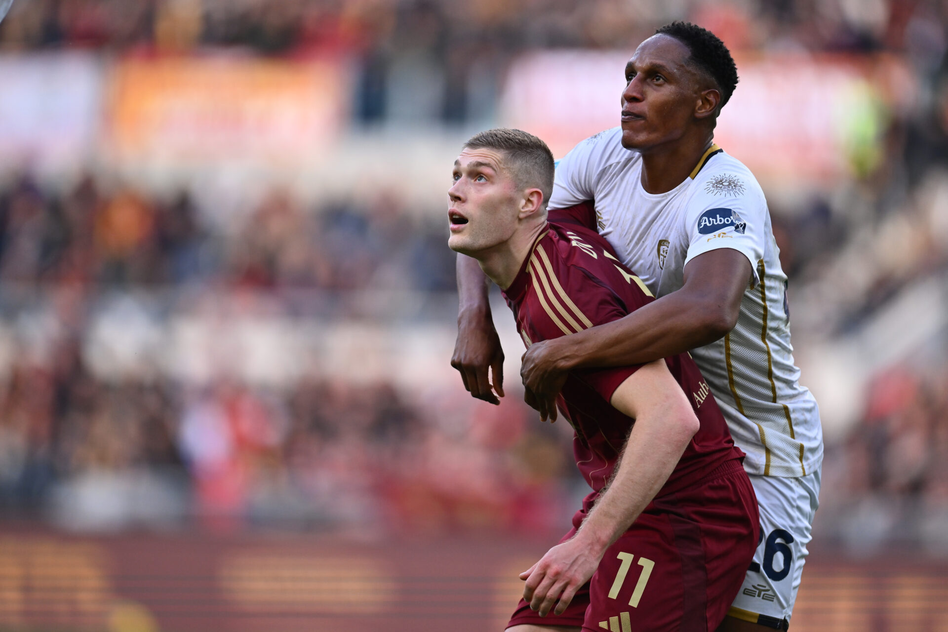 Artem Dovbyk of A.S. Roma and Yerry Mina of Cagliari Calcio are in action during the 29th day of the Serie A Championship between A.S. Roma and Cagliari Calcio at the Olympic Stadium on March 16, 2025 in Rome, Italy.