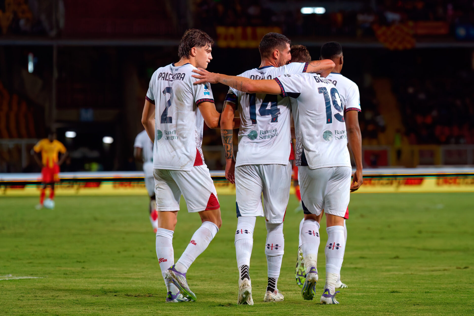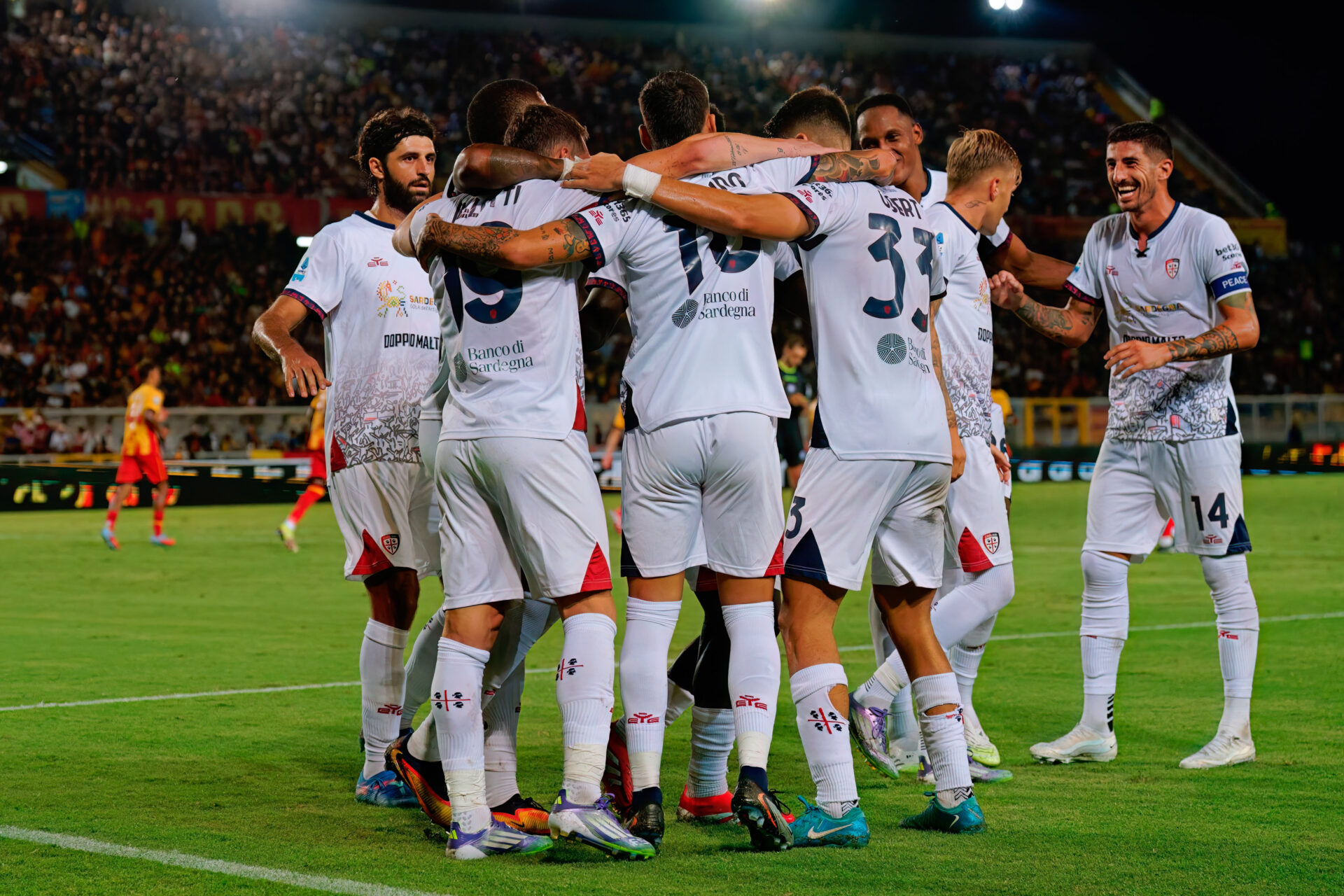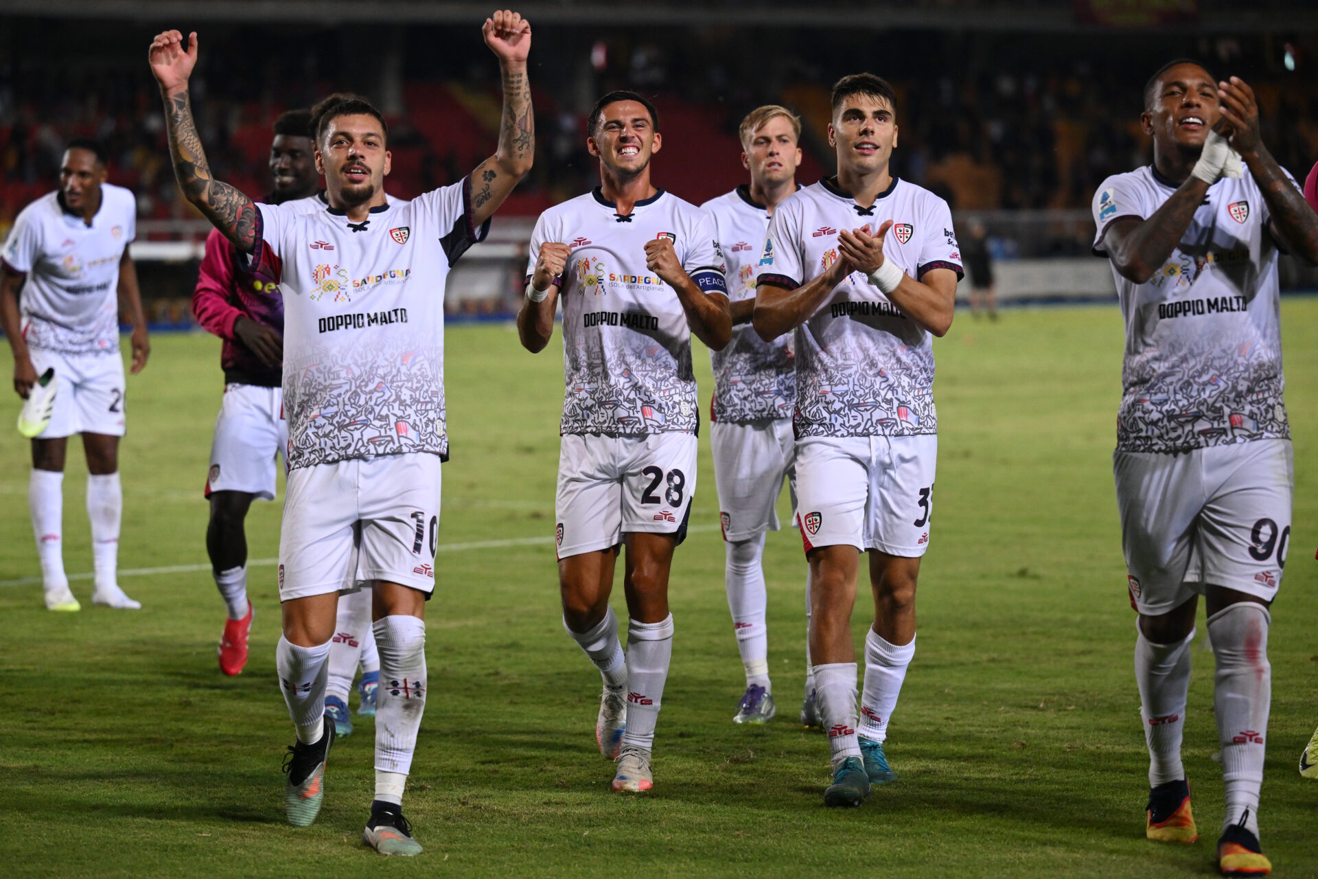 Cagliari Calcio celebrates after the victory during US Lecce vs Cagliari Calcio, Italian soccer Serie A match in Lecce, Italy, September 19 2025