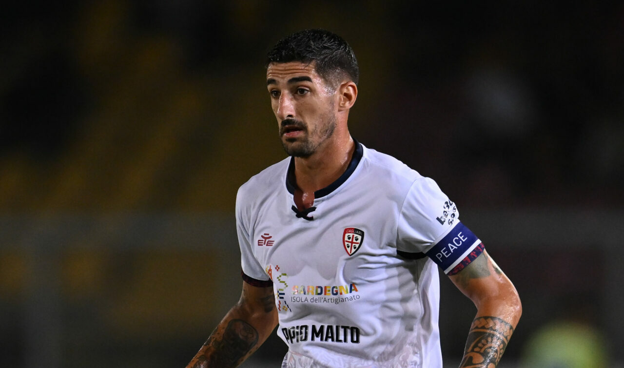 Semih Kilicsoy (Cagliari Calcio) against Kaba Mohamed (Us Lecce) during US Lecce vs Cagliari Calcio, Italian soccer Serie A match in Lecce, Italy, September 19 2025