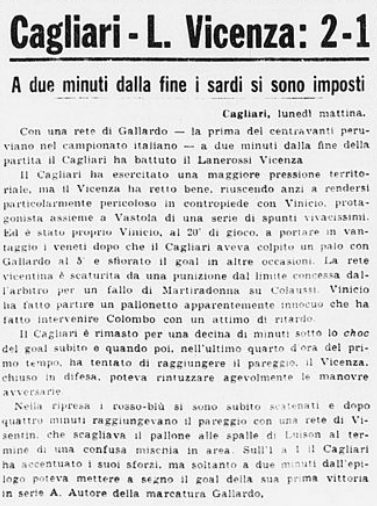 Esattamente 61 anni fa, il 4 ottobre 1964, il Cagliari vinse la sua prima partita in Serie A. All’Amsicora, la squadra di Arturo Silvestri ebbe la meglio sul Lanerossi Vicenza per 2-1 alla quarta giornata di campionato. Un avvenimento storico per la compagine isolana: l’uomo decisivo fu il peruviano Alberto Félix Gallardo, a segno a due minuti dalla fine, che contestualmente divenne il primo straniero in rete con la maglia del Cagliari nella massima categoria. I casi della vita: sulla panchina avversaria, un certo Manlio Scopigno…