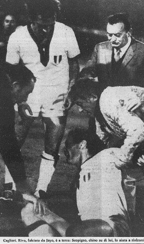 Protagonista in negativo il libero argentino dell’Atletico, Ovejero, che prende di mira Domenghini prima con un calcione e poi con un pugno al volto: l’arbitro cecoslovacco Krnavek fa finta di nulla. Poco prima dell’intervallo la sblocca Riva di testa e il cannoniere viene in seguito falciato malamente da Jayo: si scatena una rissa e gioco fermo per qualche minuto. Ristabilito un briciolo di calma, Gori raddoppia in diagonale nel recupero della prima frazione.