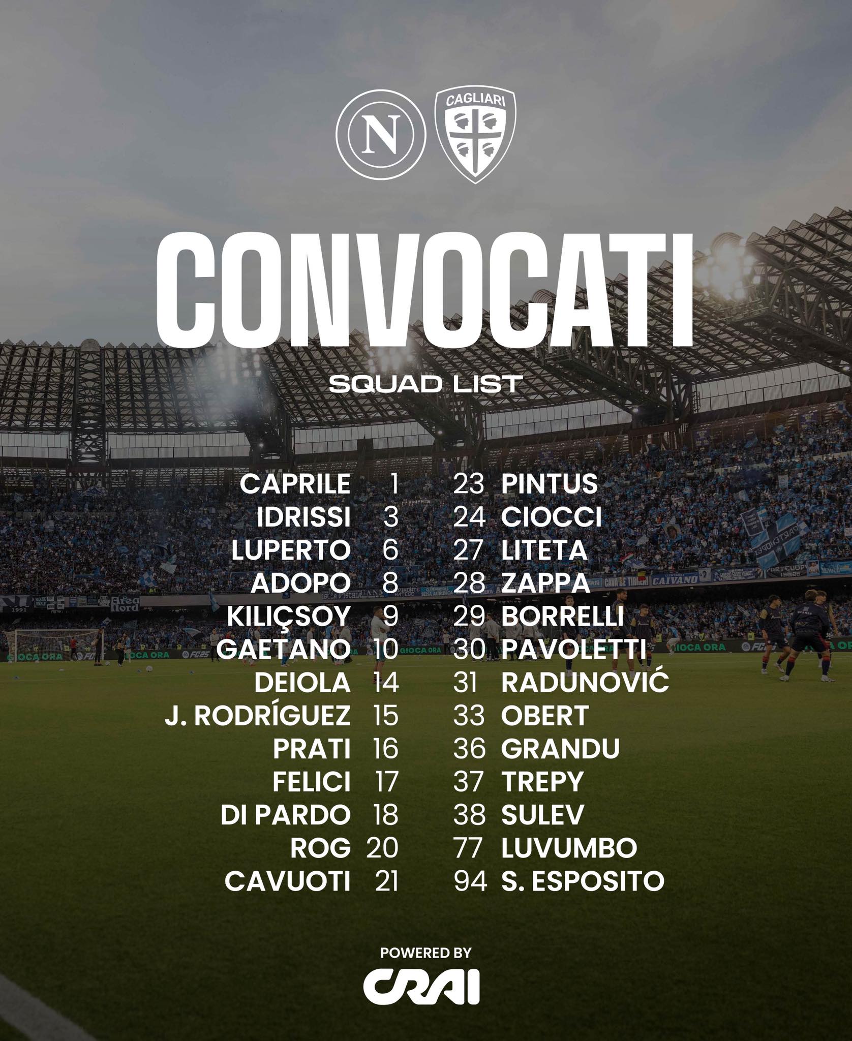 Tra i convocati, mancano Folorunsho e Palestra per precauzione, che si aggiungono a Mazzitelli, Zé Pedro, Belotti e Mina. La formazione rossoblù dovrà fare a meno di questi elementi chiave, ma Pisacane conta su una rosa che potrà comunque affrontare il Napoli con impegno.