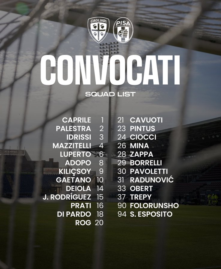 Per correttezza, il Pintus della Primavera ĆØ un omonimo, non quello della squadra A. Certo, per la partita di domani a Firenze si poteva riformare la coppia Pintus Cogoni. Trepy poteva benissimo essere lasciato per Firenze visto che domani non giocherĆ quasi sicuro. A meno che Pisacane lo faccia entrare negli ultimi 5 minuti (ahiahi!) o peggio gli farĆ fare il difensore come Luvumbo col Napoli in coppa. Vedremo.