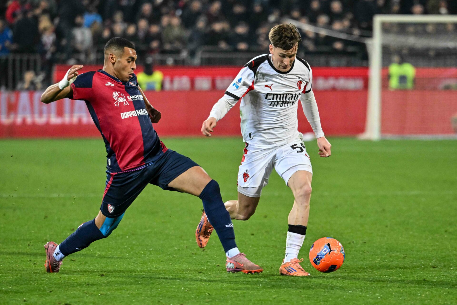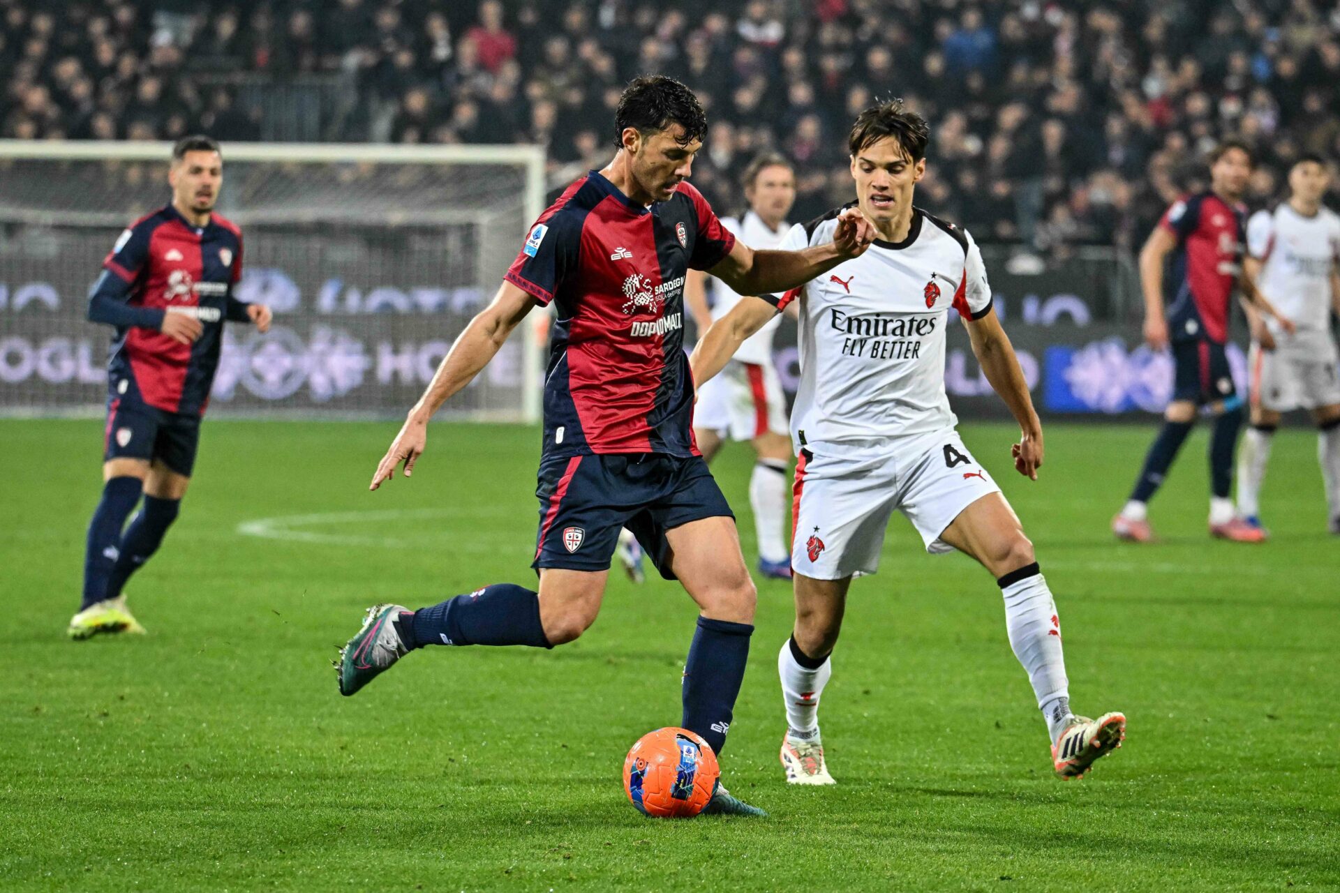 Marco Palestra of Cagliari Calcio, Alexis Saelemaekers of AC Milan during Cagliari Calcio vs AC Milan, Italian soccer Serie A match in Cagliari, Italy, January 02 2026
