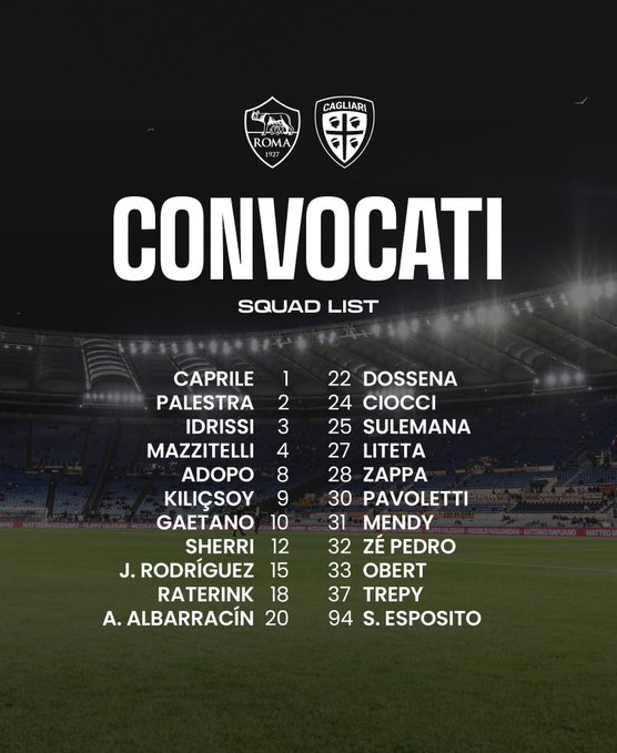 22 i giocatori disponibile per la trasferta a Roma per la gara di domani. Il Cagliari, nel posticipo delle 20.45 contro i giallorossi, presenta per la prima volta il difensore olandese Raterink. Dalla Primavera chiamato Mendy e conferma in prima squadra per Trepy.