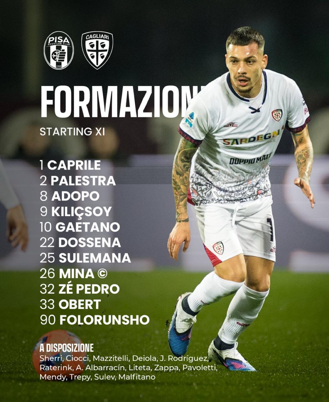 CAGLIARI (4-3-3): Caprile; Zé Pedro, Mina, Dossena, Obert; Gaetano, Adopo, Sulemana; Palestra, Folorunsho, Kilicsoy