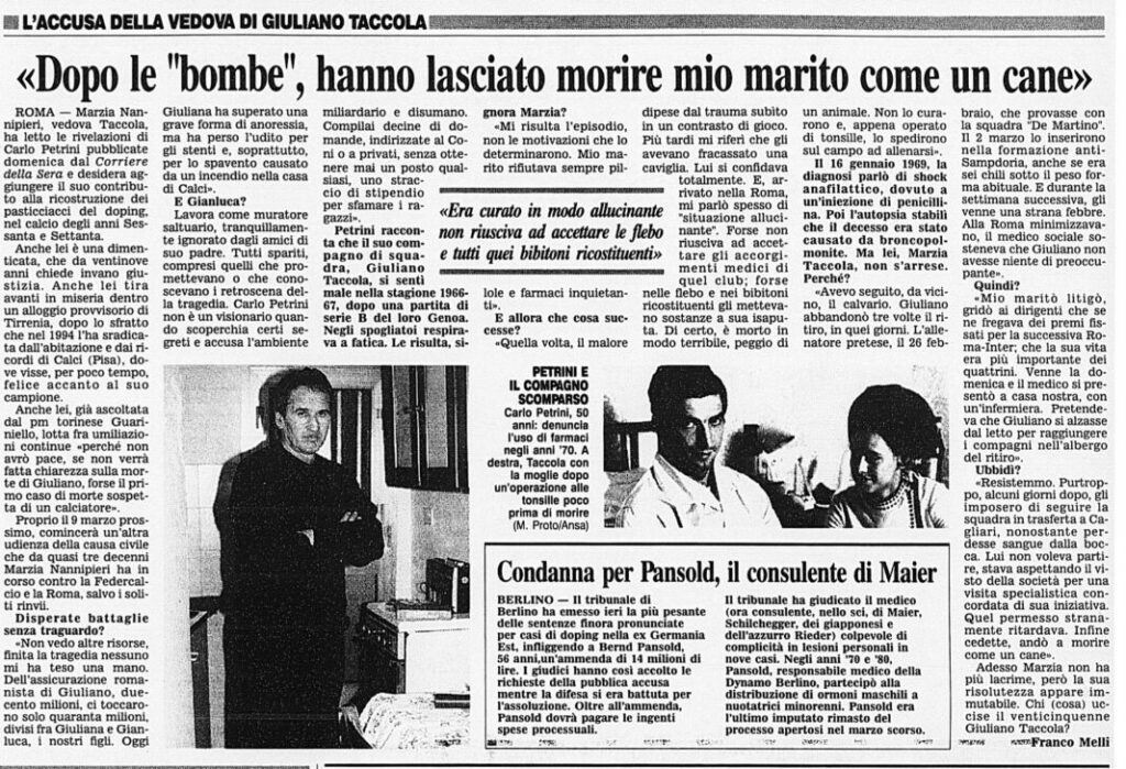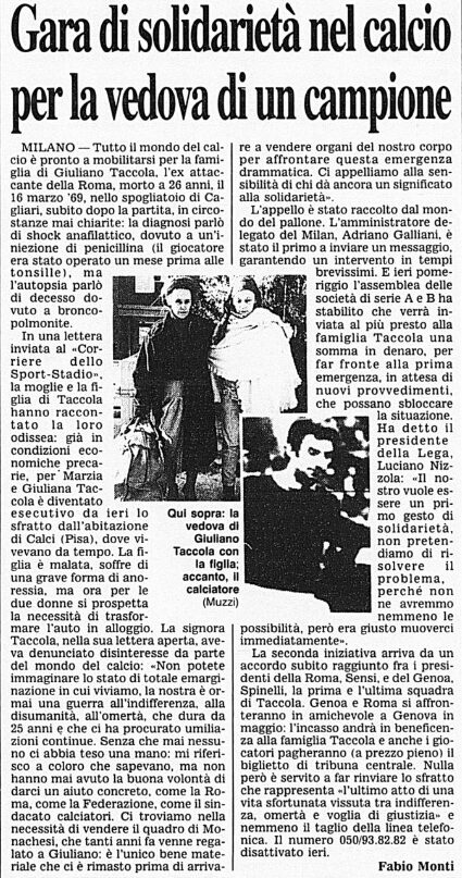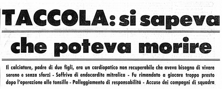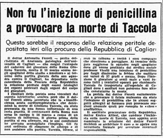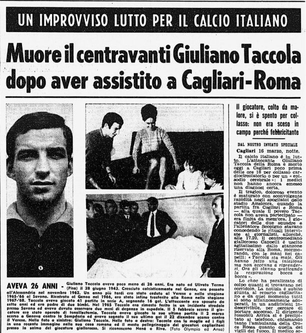 Il centravanti della squadra capitolina Giuliano Taccola era reduce da un periodo complicato a causa di vari problemi di salute. L’ottimo attaccante, che nella stagione precedente era andato in doppia cifra mostrando grandi qualità, arrancava. Motivo? Le tonsille non gli davano tregua. Finché fu operato. Avrebbe dovuto osservare un mese di assoluto riposo, invece il recupero fu accelerato rispetto ai tempi previsti. Tra febbraio e marzo era svenuto sia in allenamento che in albergo, la febbre non lo abbandonava e inoltre combatteva i postumi di un infortunio al malleolo. Accompagnò la Roma a Cagliari comunque, accomodandosi in tribuna. Si sentì male – la situazione precipitò dopo la somministrazione di penicillina effettuata dal medico sociale romanista – negli spogliatoi dell’Amsicora, giungendo all’Ospedale Civile ormai già cadavere nonostante tutti i tentativi. Polemiche a non finire per la lentezza dei soccorsi che, nel 1969, non erano certo all’avanguardia. L’ossigeno che manca. L’ambulanza che non arriva. Taccola lasciò la giovanissima moglie e due bimbi in tenera età, a 25 anni da compiere. Perché la sua vita aveva smesso di essere importante per tanti, troppi? Senza dimenticare i problemi cardiaci pregressi: Giuliano Taccola soffriva di endocardite mitralica, ma gli fu concessa ugualmente l’idoneità agonistica. Perché? L’esame necroscopico, a cui assistette pure il medico sociale del Cagliari Augusto Frongia, sentenziò: insufficienza acuta cardiorespiratoria.